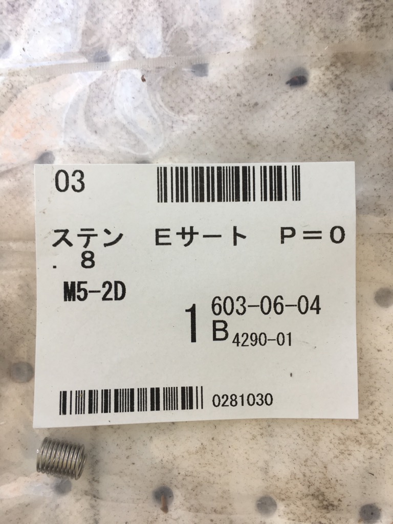 当店では、まず上写真のE-サートでネジ山を再生します。マフラーのネジはM5なのでM5用のE-サートとタップを用意します。