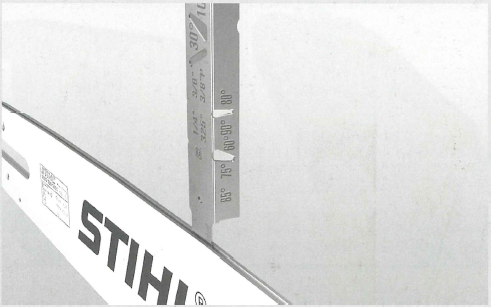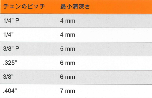 - ファイリングゲージの目盛り(溝クリーナー)を使用して、ガイドバーの上下の溝の深さを確認します。
