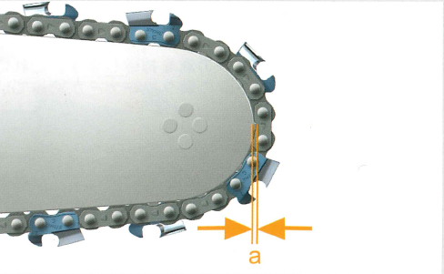 チェンとバーの先端との間には間隔(a)が必要です。間隔がない場合、つまりチェンがバーの先端に当っている場合、これは、ノーズスプロケットの歯が磨耗しているか、ノーズスプロケットのベアリングが損傷していることを示します。