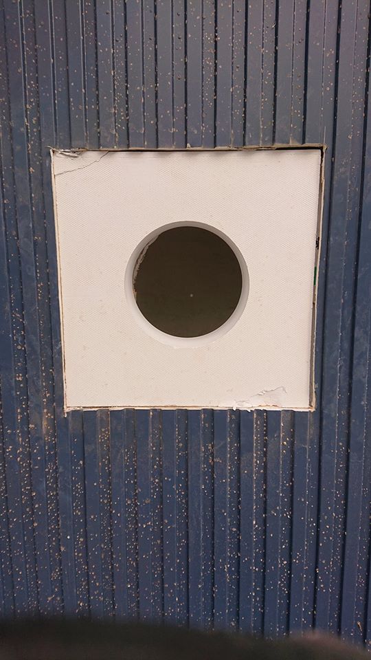 ストーブ設置場所から逆算して貫通部を割り出し、中心点に穴を開けます!