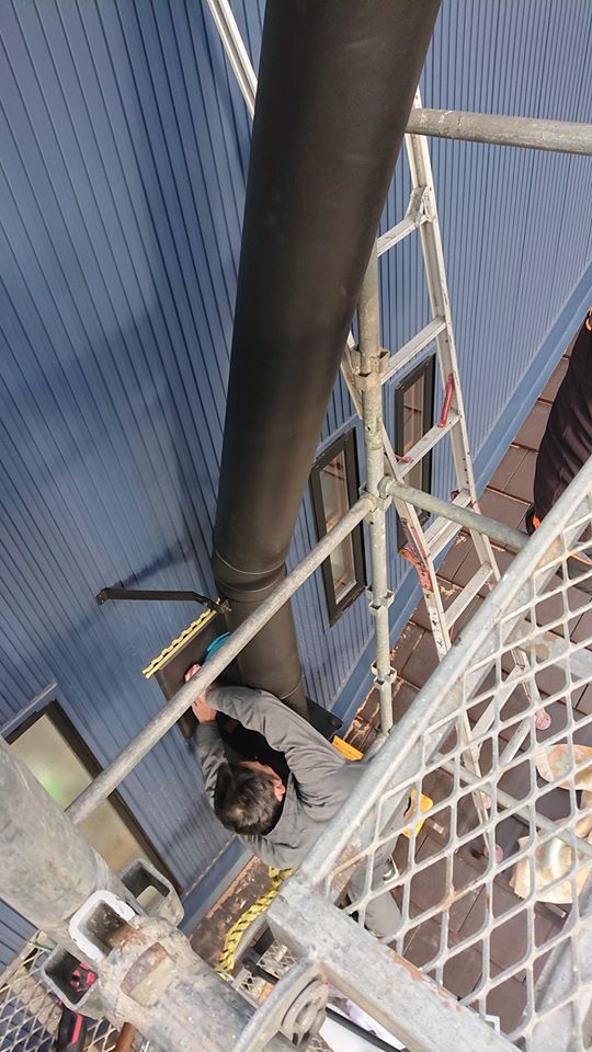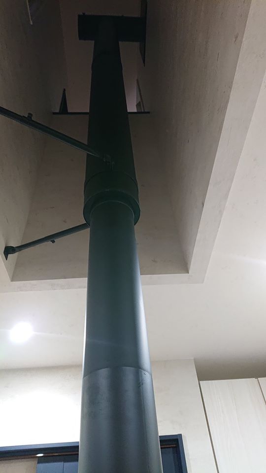 適切な場所にバンドを取付てシーリングもしっかり行い、煙筒のトップまで組み上げ完了!